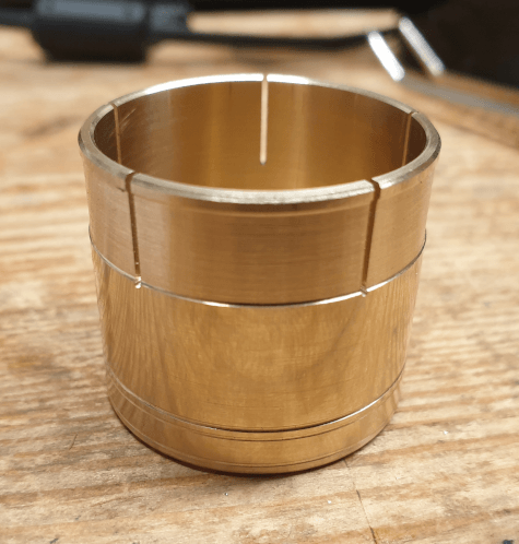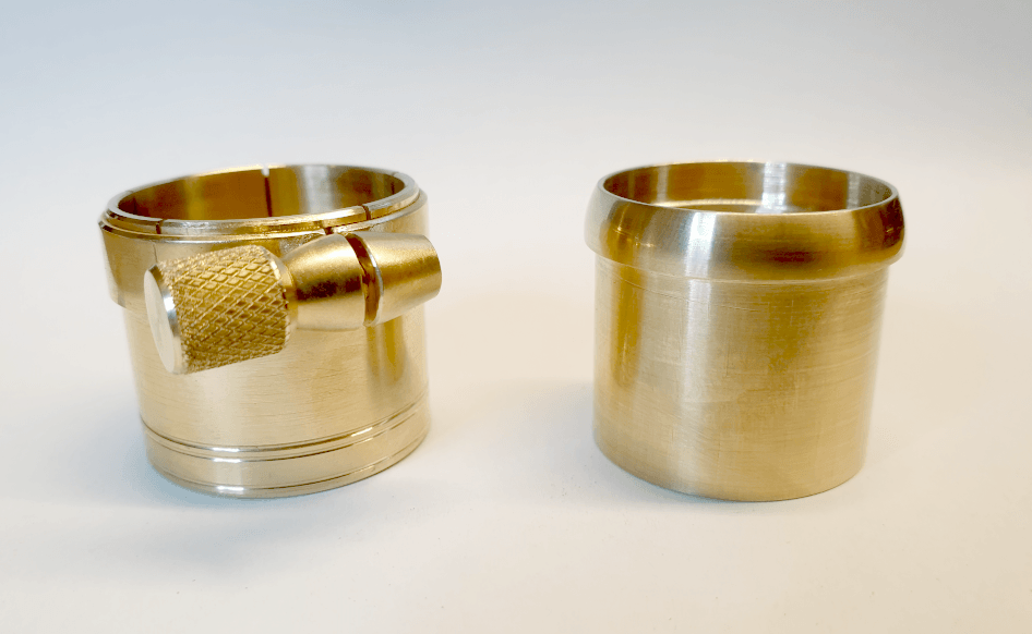 Die Aufnahme wurde auf der Drehmaschine vorgefertigt. Mit Hilfe einer CNC-Maschine mit Drehachse wurden dann die fünf Schlitze für die Klemmung präzise und winkelgenau eingefräst.