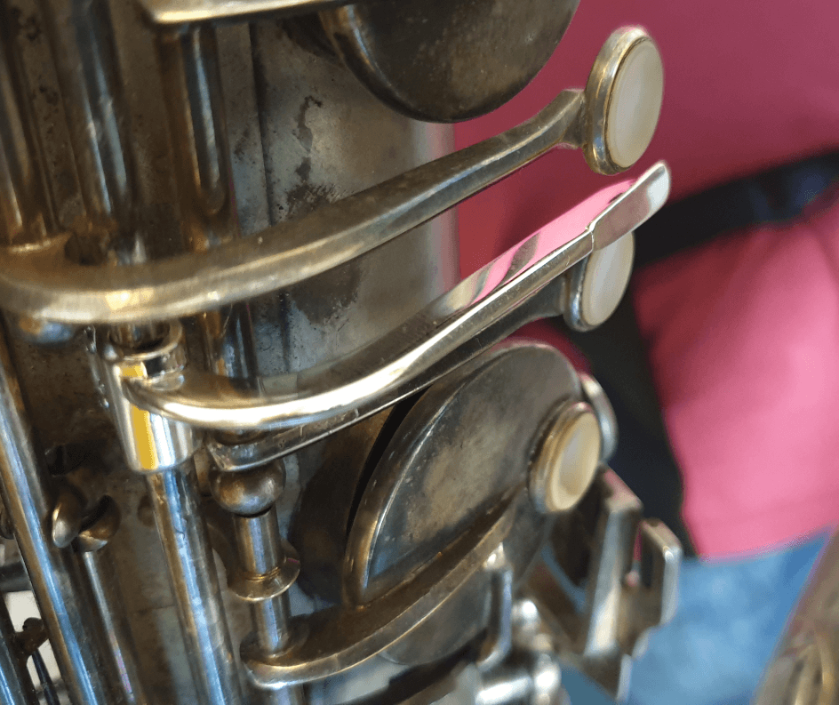 Alte Bass-Saxophone sind oft ohne Bb-Drücker der linken Hand gebaut. Stattdessen wird der Ton über die Seitenklappe gegriffen.